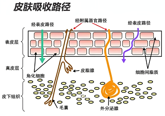 角質(zhì)層是主要的吸收途徑,經(jīng)角質(zhì)層滲透的途徑有細(xì)胞間途徑和跨細(xì)胞途徑兩種:(1)細(xì)胞間途徑:化學(xué)物質(zhì)繞過角質(zhì)細(xì)胞,通過角質(zhì)細(xì)胞間連續(xù)分布的細(xì)胞間質(zhì)透入皮下;(2)跨細(xì)胞途徑:化學(xué)物質(zhì)直接穿過角質(zhì)細(xì)胞和細(xì)胞間質(zhì),在水相和脂相中交替擴(kuò)散。